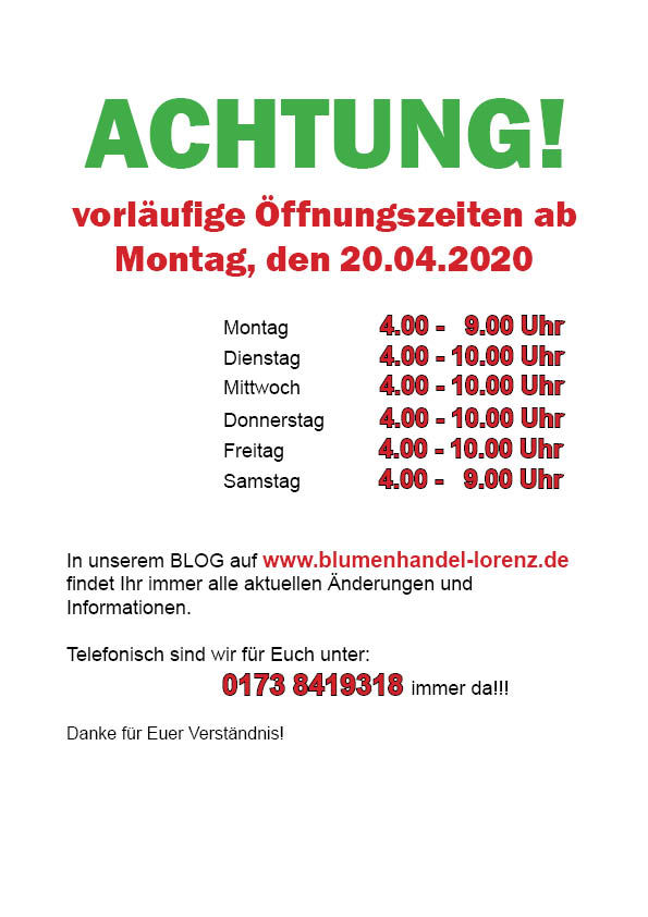 Vorläufige Öffnungszeiten!clorenz196320. Apr. 20201 Min. Lesezeit Selbstverständlich steht 3 x die Woche frische Gärtnerware vom Niederrhein, in vielfältiger Auswahl an Sorten und Farben, in unserer Filiale für Euch bereit.
